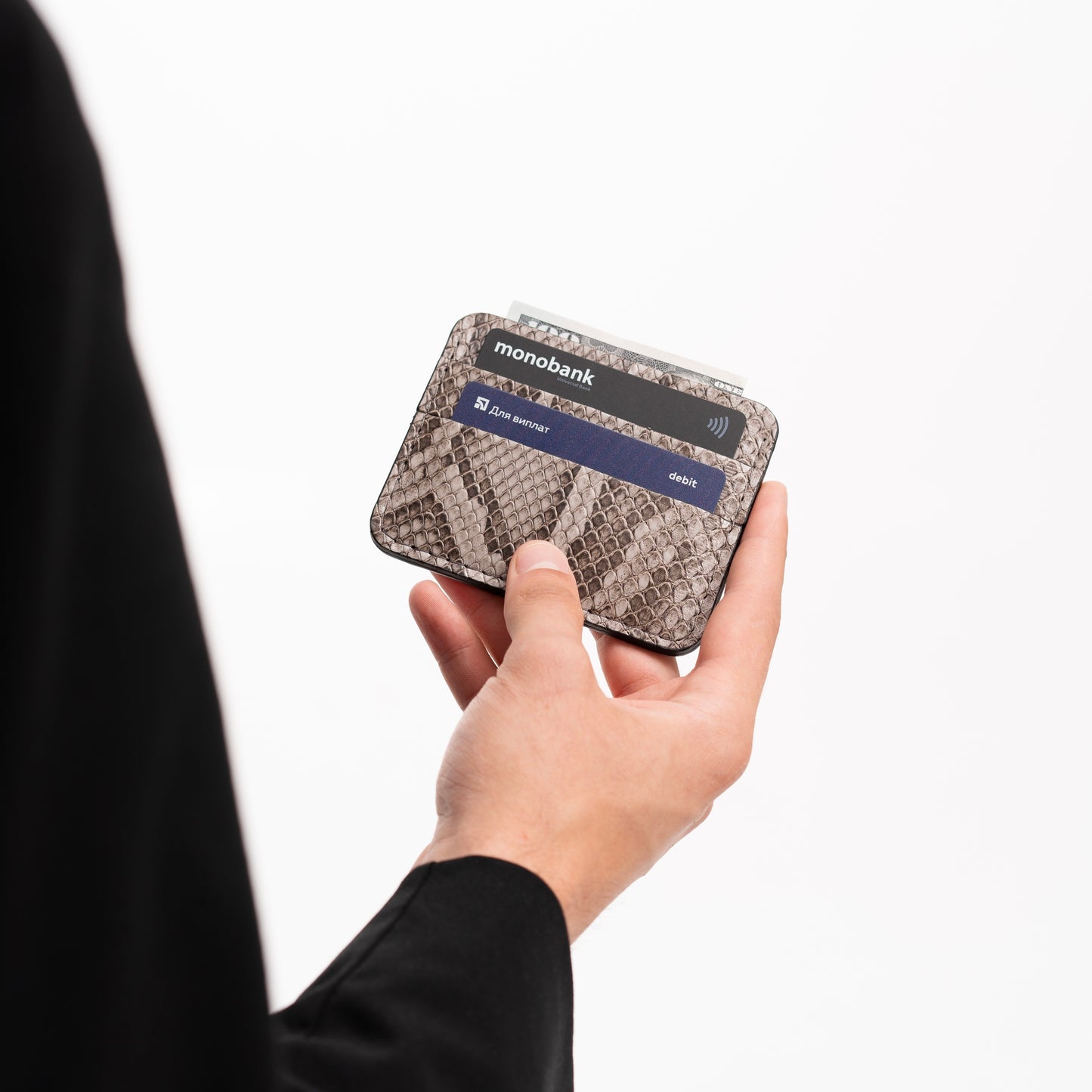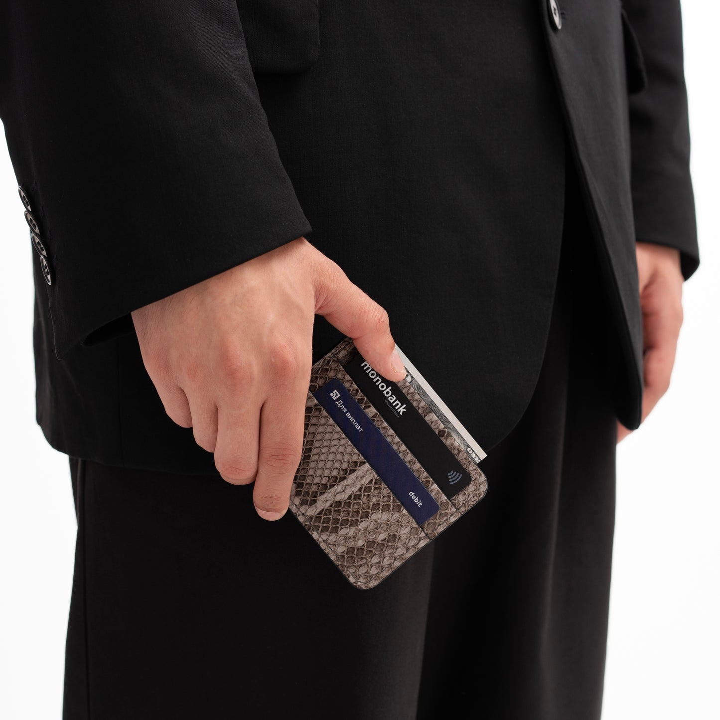 An impeccable accessory designed for true connoisseurs of luxury and elegance. All leather accessories are handcrafted by our artisans. We use the highest quality leather combined with the best materials to ensure premium-class products. * Please note! The color and shade may vary depending on monitor settings (brightness, contrast, saturation), as well as lighting. Why choose a cardholder made of python leather? Each piece of python leather used in this cardholder is carefully selected to ensure the highest quality and uniqueness. One of the main advantages of this prestigious cardholder is its functionality and practicality. It provides organized storage for your card collection with comfort and style. Thanks to its compact size, it easily fits into your pocket or bag, allowing you to have all the necessary cards at hand. Premium-quality materials. The cardholder is made of premium-class materials, with a special emphasis on high-quality python leather. Each cardholder is handcrafted by masters of their craft with extraordinary attention to detail to ensure unmatched quality and perfection. The fine scales on the python leather create a captivating effect, adding sophistication and luxury to the cardholder. How to choose a cardholder? If you're looking for a quality cardholder made of leather, will help you choose the right model. We offer elite cardholders made of not only python leather but also other exotic materials. We value each of our customers and are happy to assist you with any questions. Buying a cardholder from us is always beneficial and enjoyable. |