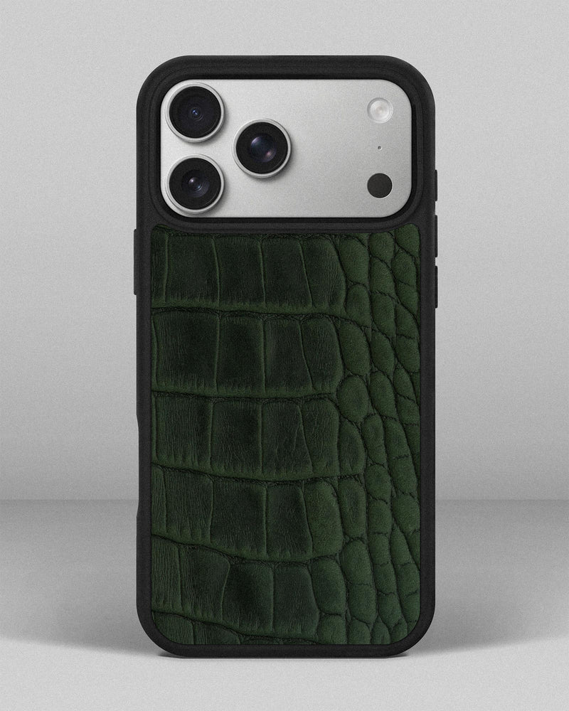 Виготовлений з високоякісної телячої шкіри, цей чохол має яскравий і розкішний вигляд. Темно-зелений колір з тисненням під крокодила додає чохлу елегантності та витонченості, підкреслюючи його стильний характер.